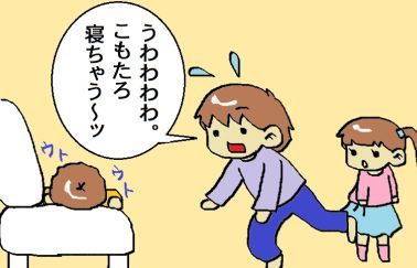 見てはいけないものを・・・ 2011-11-10 カテゴリ: こもたろ 我が家の長男坊、こもたろ(3歳)は自閉症です。睡眠障害の気があるので家ではなるべく昼寝をさせないようにしています。ある日のこと。こもたろを寝かすわけにはいかん。いつもやられてる”アレ”今度はこちらがやってやる番・・・。朝の恨みを晴らす時がきたのだ。ほーれ