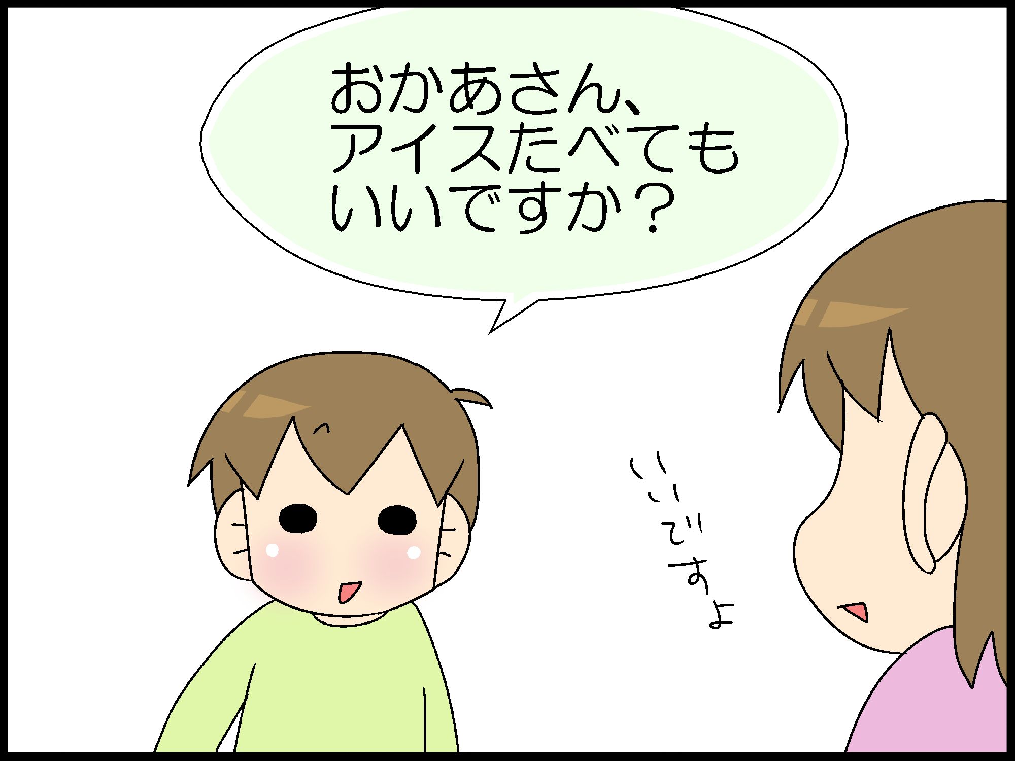 「アイス食べられたら、僕嬉しいな🎵」ってことですよね。大人から見たら、ププ😁💨💨って笑っちゃうような言葉遣いだけど、上手に自分の気持ちを言えてるじゃないですか。