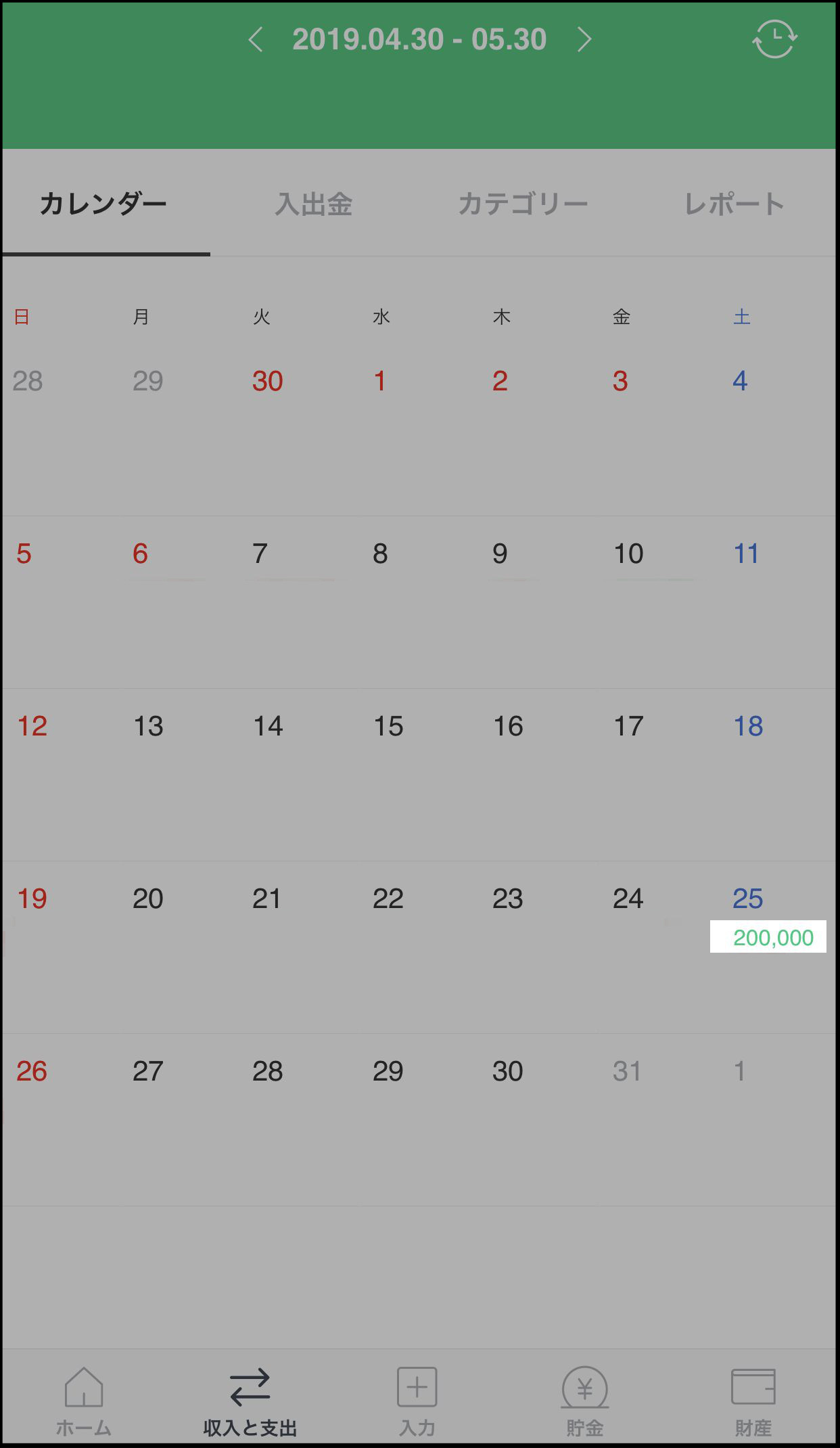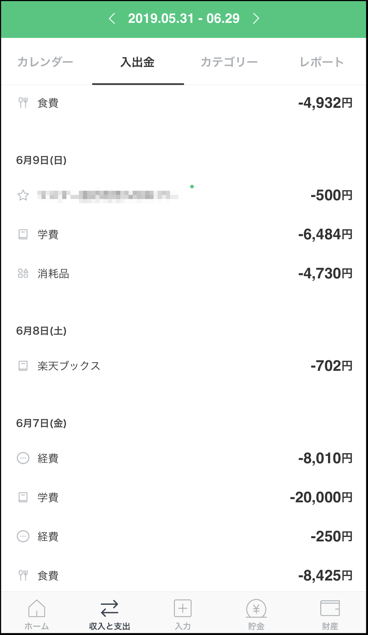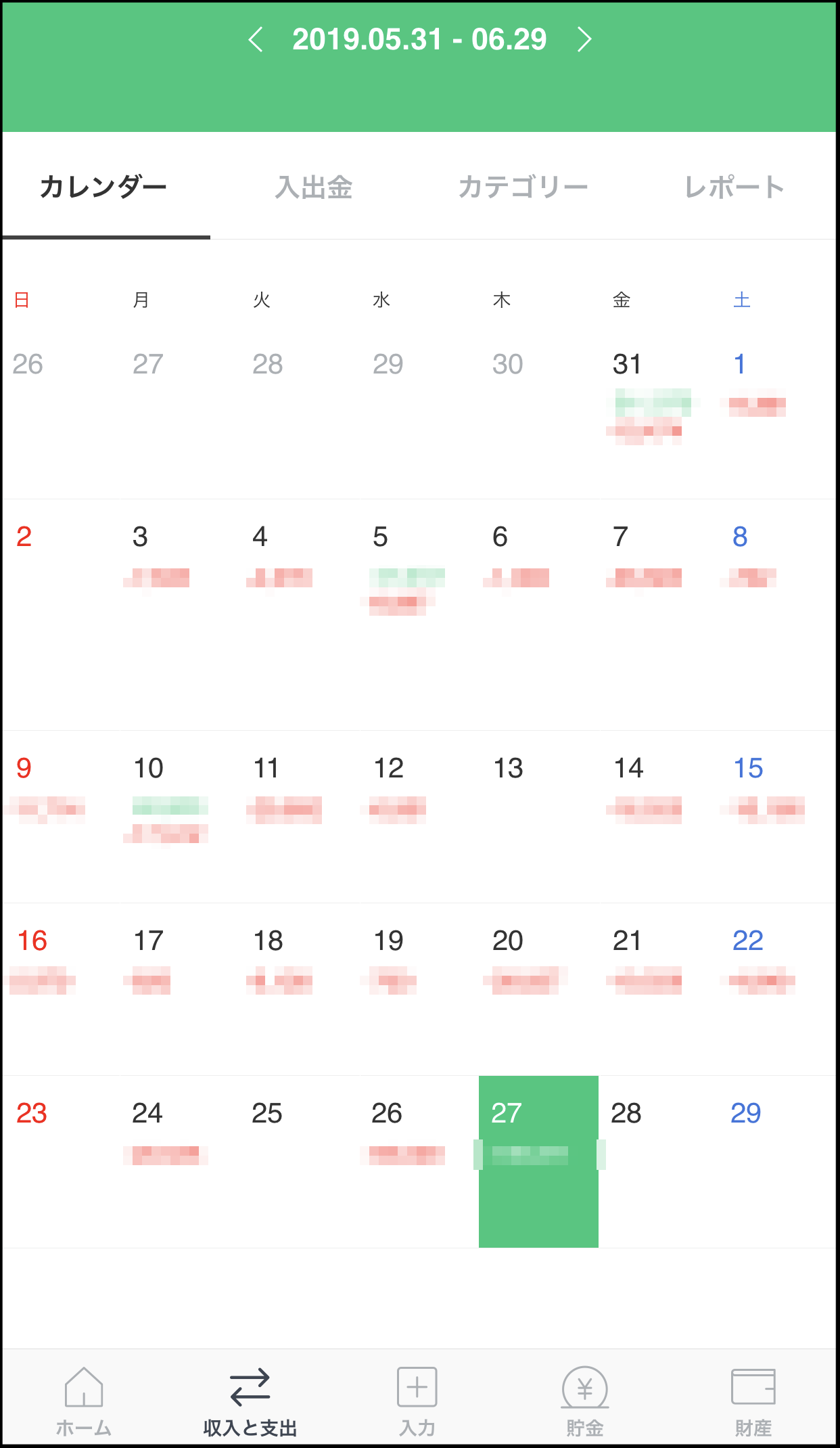収入は緑字、支出は赤字で表示されて