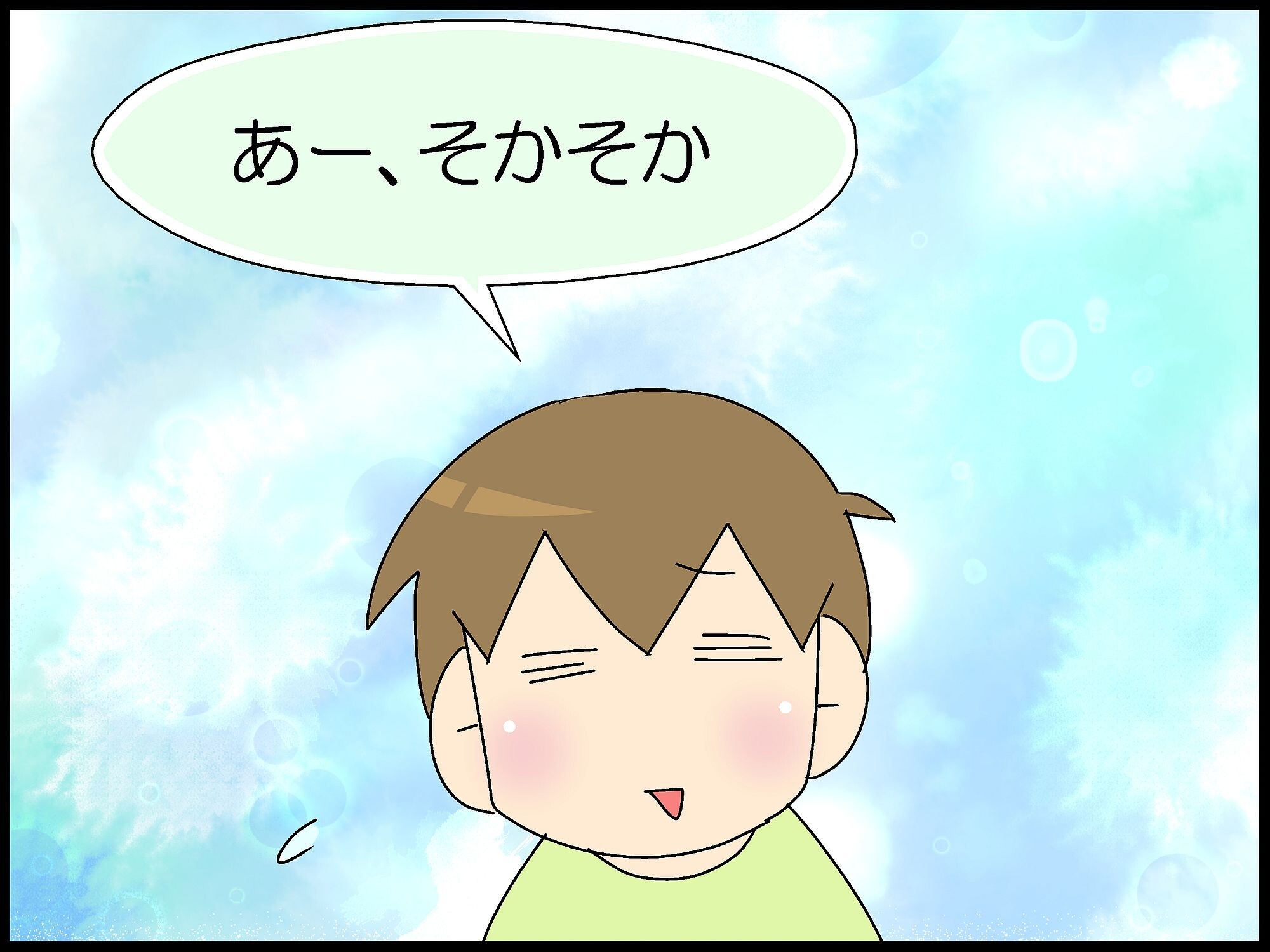 たろくんの発言のような、そのまんま、私も昔同じ感じで相手に返しちゃってたのを思い出して、たろくんみてると懐かしいなーって、思います。微笑ましい漫画を、これからも楽しみにしていますね。