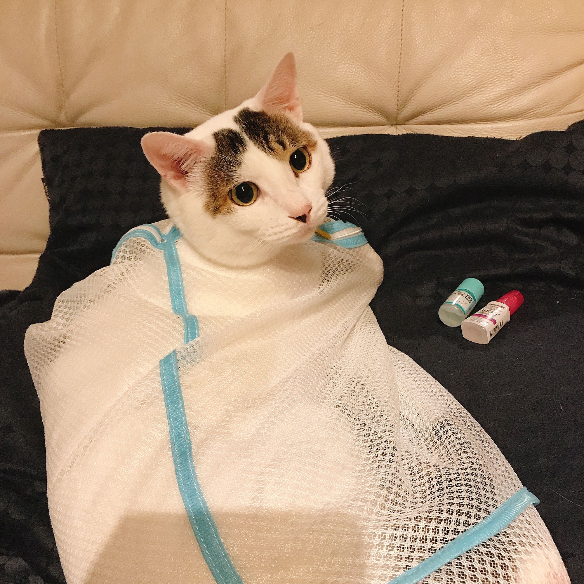 獣医さんから、『前から点眼すると怖がるから、後ろから点眼をさしてあげるといいですよ』と教えてもらいました‼︎