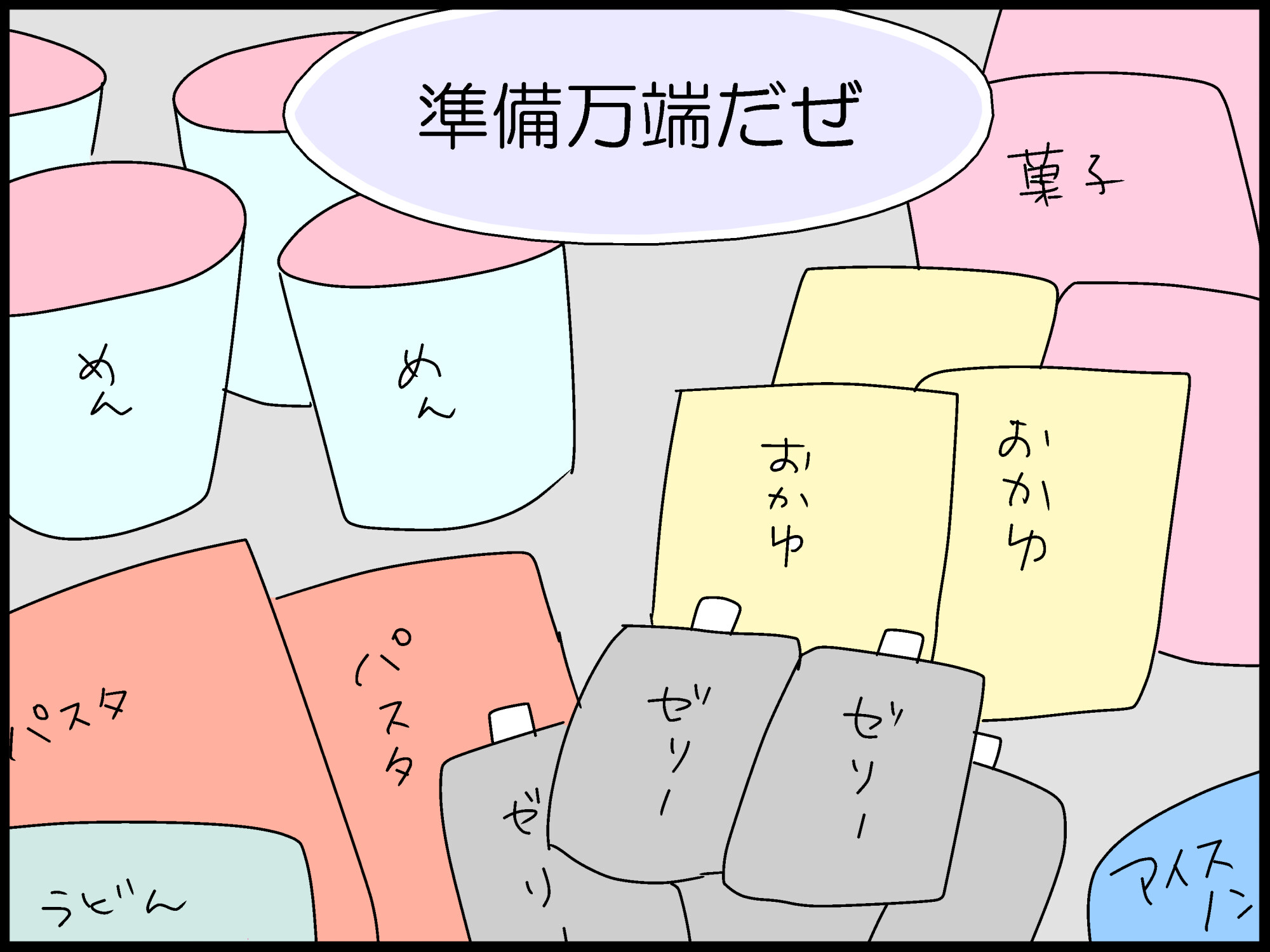 栄養ドリンクにスポーツ飲料、おーえーすーわん、インスタントお粥など二、三日引きこもれる準備してたんですけどね。