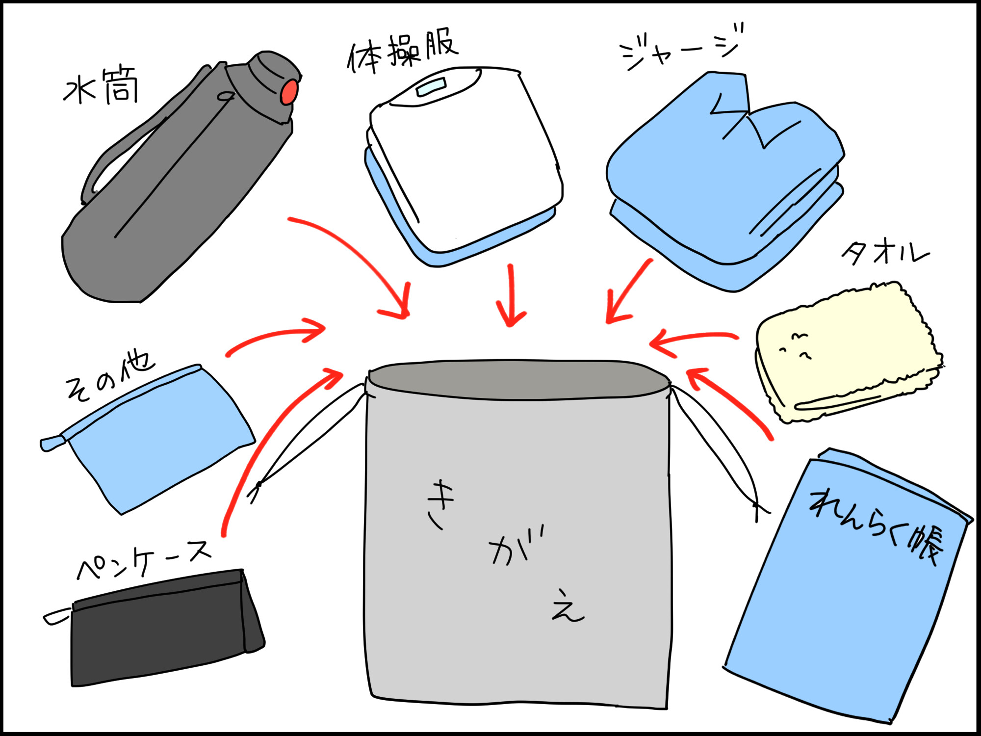 この着替え袋の方に持ち物を全て入れる。