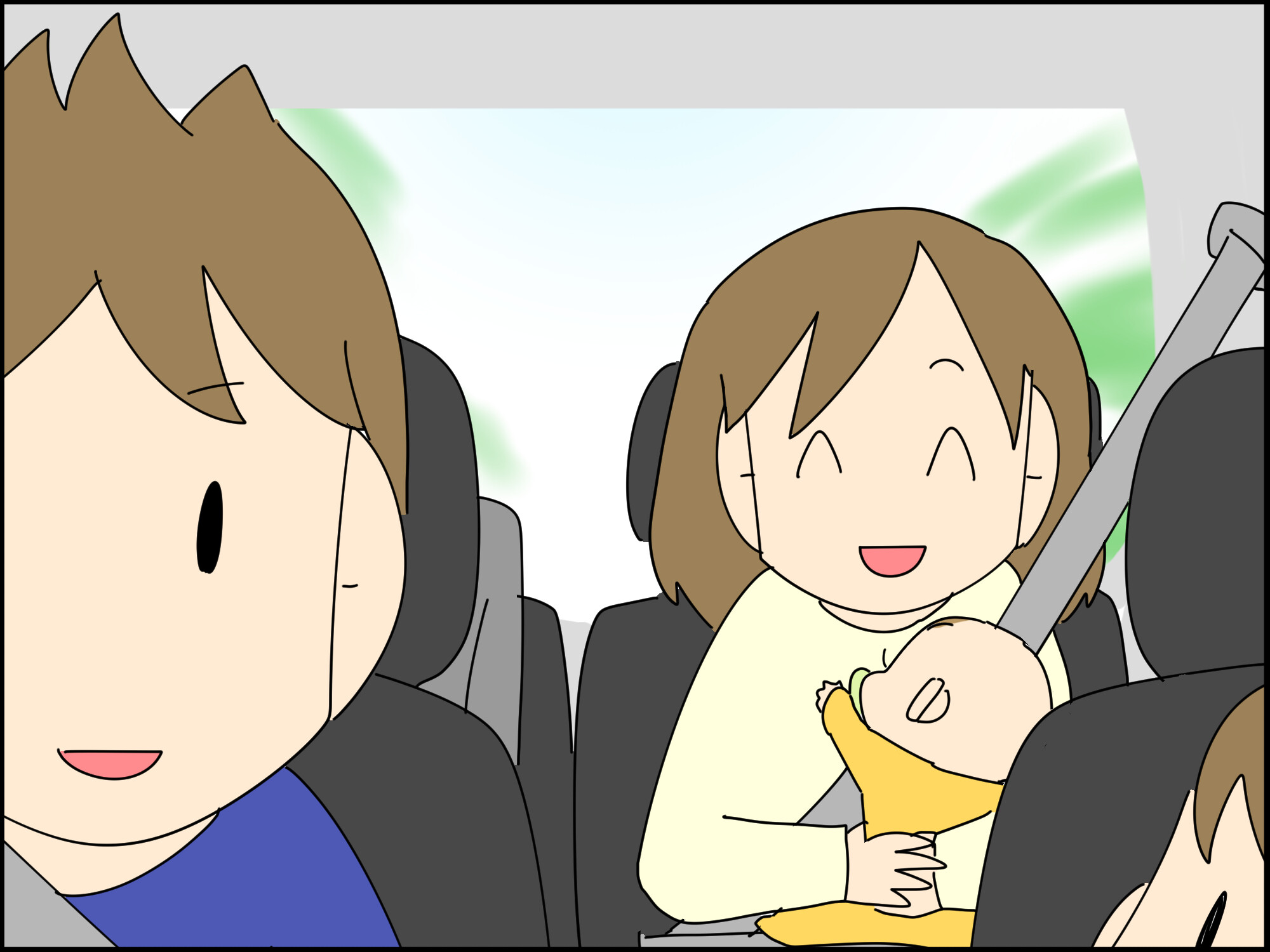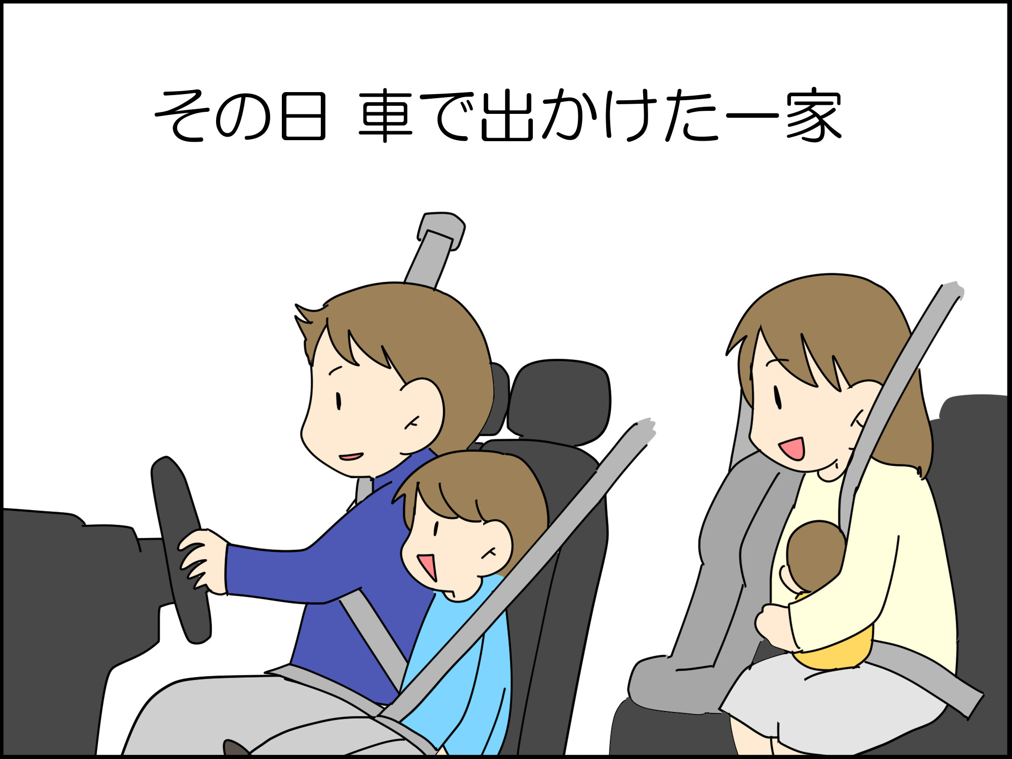 上の子が助手席(意味のなさないブースターシートを申し訳程度に設置)で、後部座席にママと赤ちゃん。