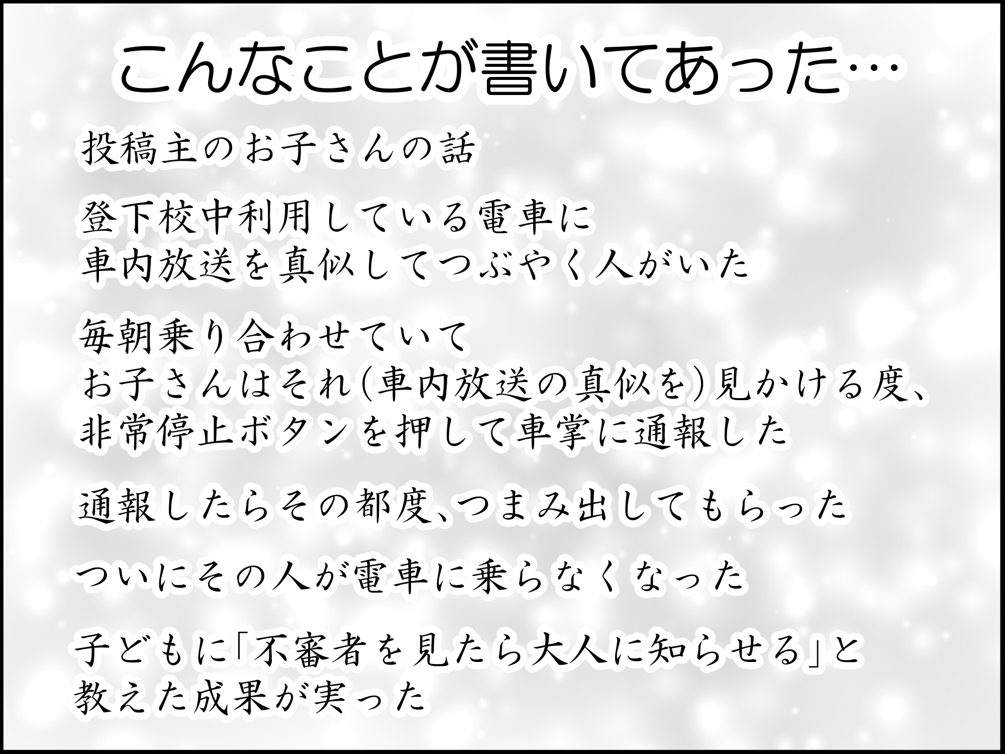 それに、電車の非常停止ボタンなんて刃物を持った人が現れた時レベルの最終手段ですよ。そんなものを気軽に(その子にとっては重大事案だったとしても)押すことも注意しないとダメですよね。
