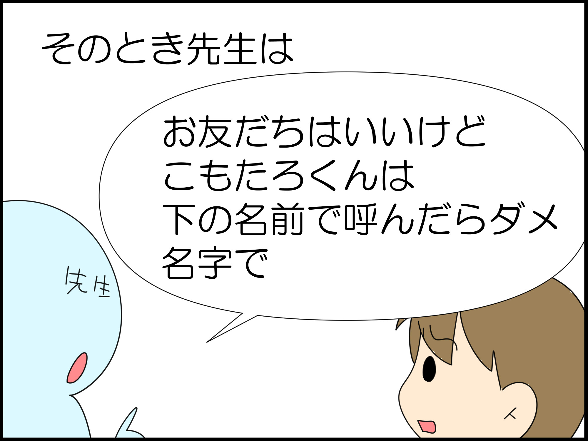 その下の名前で呼んでいいよって言われてる子は、社会人以降のトラブルに繋がらないだろうという判断が先生の中にあったんでしょうね。(羨ましい、自分も下の名前で呼びたい)っていう感情は一旦自分側で受け止めて、だけど、なぜ先生の対応に違いが生じたのかを分析して納得できると良いですよね。配慮の違い。逆に、社会でこもたろくんがなんらかの配慮を受けた時に、羨ましいと思う人も現れるかもしれないわけで。