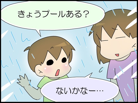 プールある? 2018-7-9 カテゴリ: こもたろ 今日はプール予定の日。なんだけど、朝からあいにくの雨天。この雨だと、ないんじゃないかな。急に晴れるとかなら、わからないけど。「ない」と断言されないと不安だから持って行きたい、こもたろ。そして学校へ。こもたろ、先生に質問。ここではっきり言ってもらいちょっと